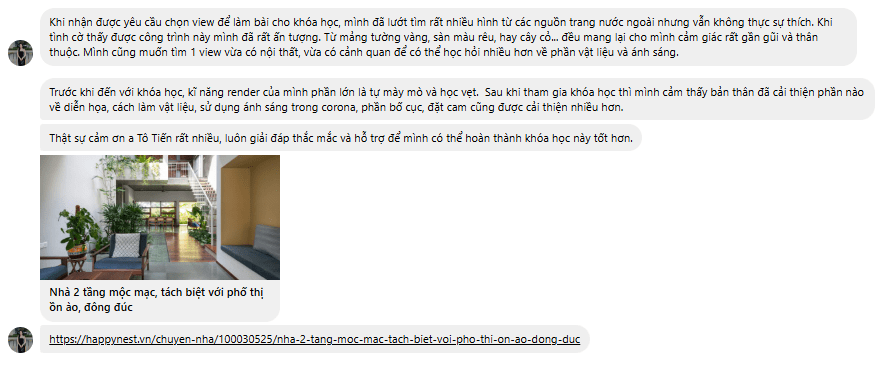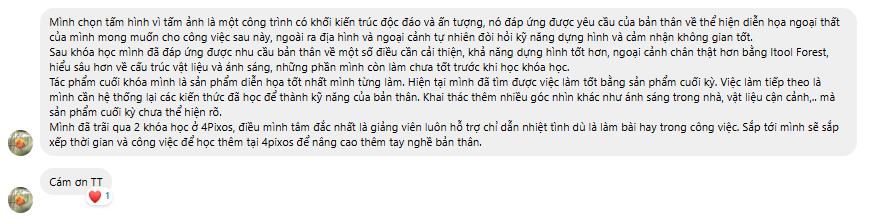 - Không chỉ thành thạo kỹ thuật, bạn còn được trau dồi tư duy thẩm mỹ – biết cách truyền tải cảm xúc, tạo chiều sâu và kể câu chuyện riêng cho từng dự án, công trình.