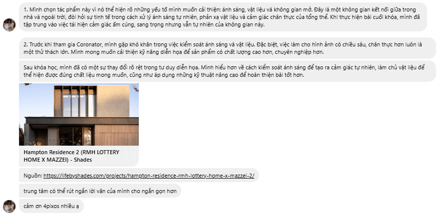- Nội dung: Học viên sẽ đưa ra nhận xét về hình ảnh các bạn chọn. Giảng viên sẽ nghe và giải thích lại về hướng các bạn phân tích đã phù hợp chưa, từ đó giúp các bạn hiểu hơn về hình ảnh, sau đó mới đến việc dùng kỹ thuật để tái tạo lại.