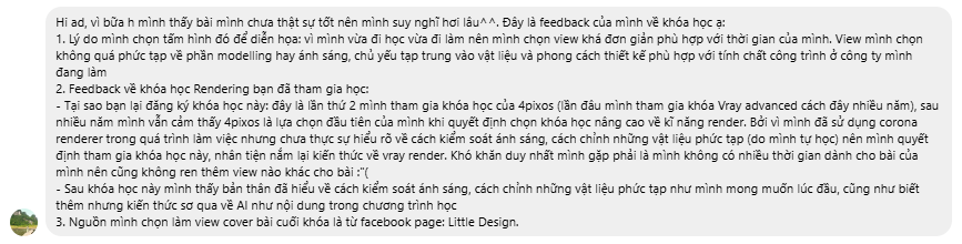 - Cơ hội nâng tầm portfolio và giá trị cá nhân – từ việc “chỉ render được” đến “render khác biệt”, giúp bạn nổi bật trong môi trường tuyển dụng và đáp ứng những khách hàng khó tính với yêu cầu cao.